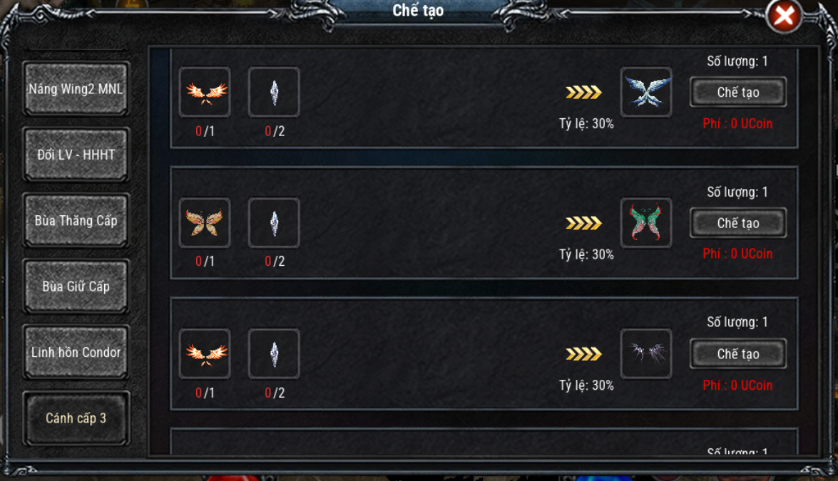 - Nếu thành công, nhận được ngẫu nhiên 1 trong 7 loại Wing 3