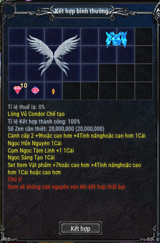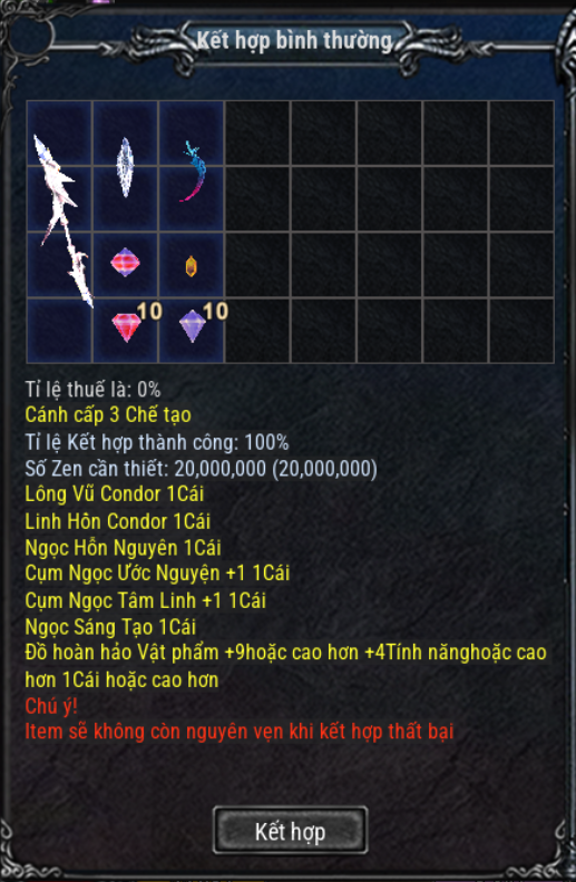 - Nếu thất bại, toàn bộ vật phẩm và nguyên liệu trong khung kết hợp sẽ biến mất.
