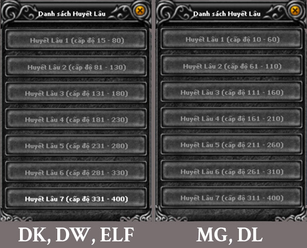 Huyết lâu bao gồm 7 tầng tùy theo cấp độ của nhân vật.