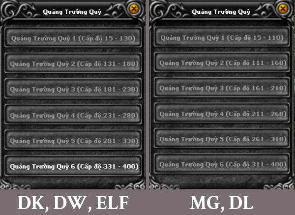 Quảng Trường Quỷ bao gồm 6 tầng tùy theo cấp độ của nhân vật.