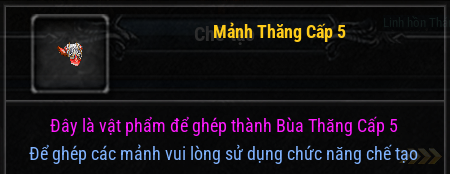- Bùa thăng cấp được chế tạo từ 16 Mảnh thăng cấp tại giao diện chế tạo
